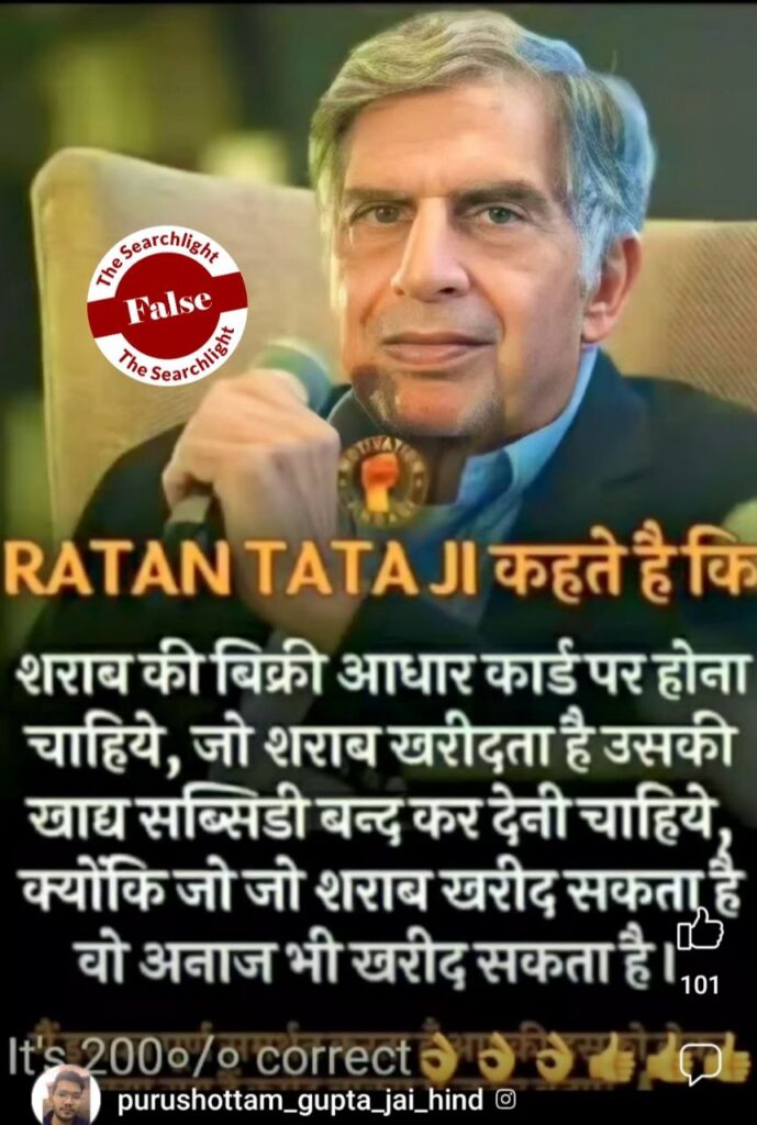 नई दिल्ली: यूँ तो बहुत से लोग दिग्गज व्यवसायी रतन टाटा को अपना आदर्श मानते हैं और उन्हें फॉलो करते हैं उनके जैसा बनना चाहते हैं. समय-समय पर रतन टाटा के मोटिवेशनल कोट्स हमारे बीच दिखाई पड़ते रहते हैं. ऐसा ही एक इन्फोग्राफिक इस वक़्त सोशल मीडिया पर एक बार फिर से वायरल हो रहा है जिसमे ये टेक्स्ट लिखा हुआ है की ‘शराब की बिक्री आधार कार्ड पर होना चाहिए जो शराब खरीदता है उसकी खाध सब्सिडी बंद कर देनी चाहिए , क्योंकि जो शराब खरीद सकता है वो अनाज भी खरीद सकता है’ दावा किया जा रहा है की ये बात रतन टाटा न कही है.